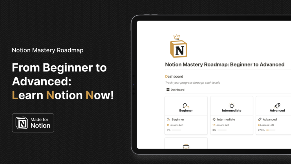 - Notion Mastery Roadmap -Structured Learning, Simplified: The roadmap provides you with categorized lessons from beginner to advanced levels, ensuring you never feel overwhelmed. Each lesson is designed to build upon the last, making your journey seamless and focused.
