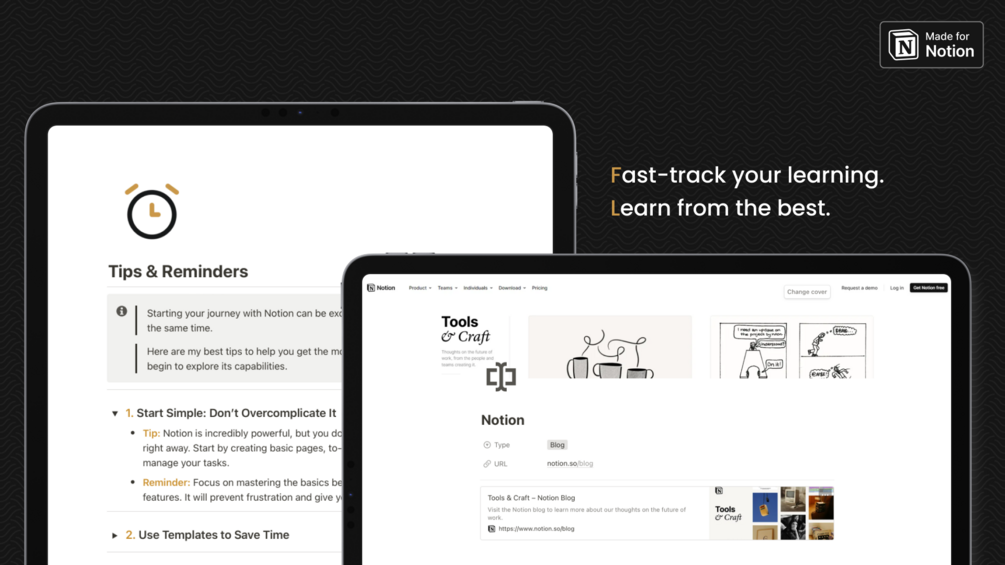 - Beginner Friendly Tips - Get Started Like a Pro: Avoid common mistakes with essential tips and reminders designed specifically for new users. These quick insights will help you confidently navigate Notion's key features and become comfortable with the tool.