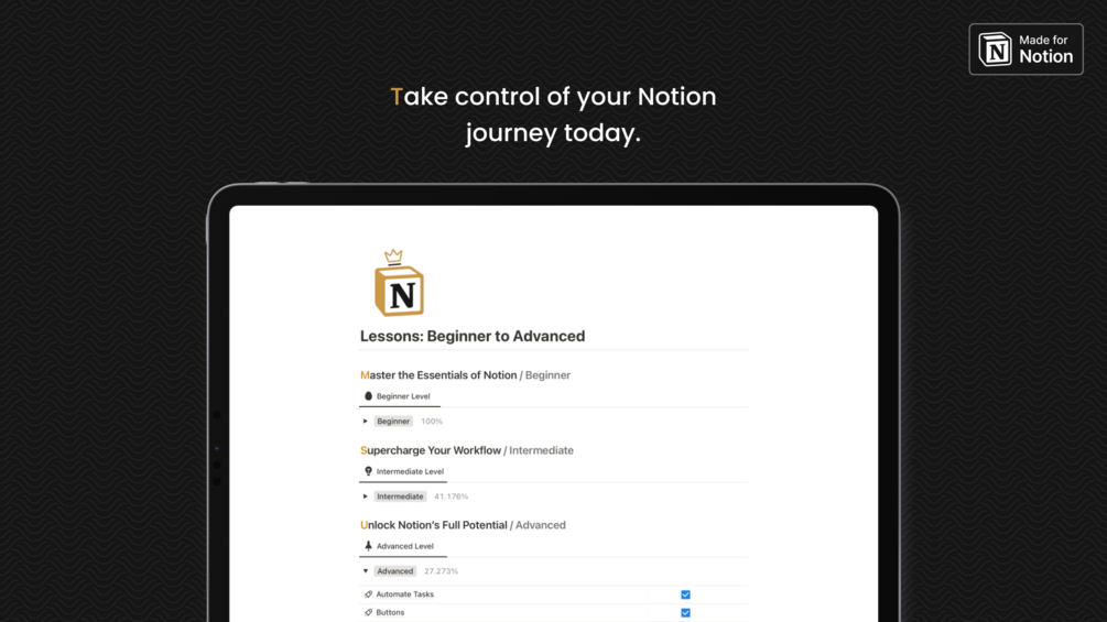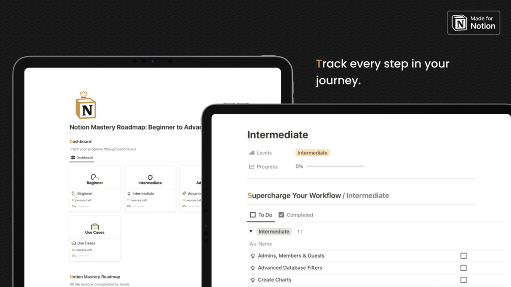- Dashboard - Track Your Mastery Progress: Stay organized and motivated by tracking your progress through each level. The dashboard gives you a real-time view of where you stand and what you need to accomplish next to become a Notion expert.